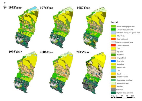 As can be seen in Figure 2 and Table 2, between 1958 and 2015, the area of high-coverage grassland in the Manas River Basin was reduced from 4154.70 to 3112.10 km2. The areas of medium-coverage grassland, low-coverage grassland, sparse wood and shrub wood were reduced from 4560.48 to 2694.08 km2, from 5908.05 to 3816.58 km2, from 75.85 to 44.78 km2, and from 1900.98 to 41.44 km2, respectively. Although the natural forest and grassland increased in some years, the total area has followed a decreasing trend. In addition, the relevant literature indicates that, during the 1950s, mountain forests covered 1500 km2 of the basin; 38% of these forests have since been harvested. Grassland areas have also decreased due to overgrazing, and vegetation cover has shifted from tall trees and shrubs to low shrubs. For example, the prevalence of reeds has declined by nearly 91%, with only 24 km2 remaining; only 212 km2 of desert forest is intact, and the remaining vegetation has been impacted by desertification at a rate of nearly 927 km2/a.