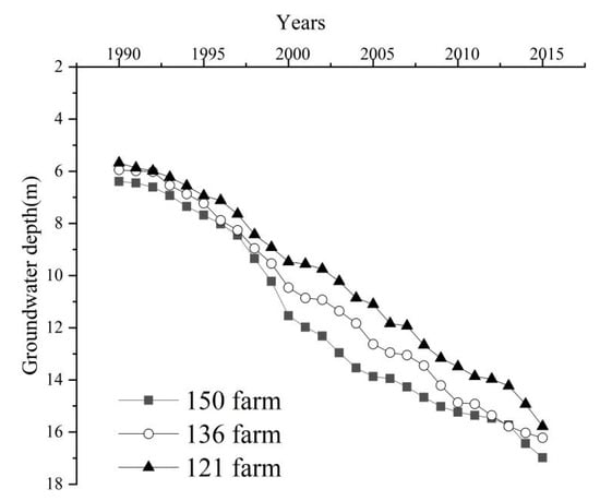 The change in groundwater depth at farms 150, 136, and 121 from 1990 to 2015.