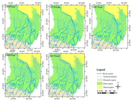 Since the 1950s, a series of artificial diversion channels has been built in the Manas River Basin, which has obviously changed the basin’s water system structure (see Table 3 and Figure 4). For example, from 1958 to 2006, the length of the water system continuously increased. From 1958 to 1976 and from 1987 to 2006, the growth rates were 32.65 and 29.71 km/a, respectively. This shortened—or even cut off—the lower reaches of the Manas River, causing the water quality to deteriorate, decreasing biodiversity and limiting the water supply to grasslands, pastures, the oasis margin and the transitional desert zone [31,32,33,34].