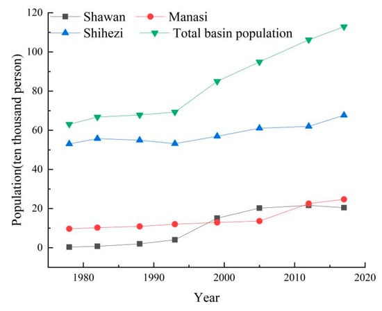 From 1978 to 2017, the population of the basin increased from 630,700 to 1,128,500, i.e., almost doubling. The population of Manas, Shihezi and Shawan showed an increasing trend (Figure 5). Through the analysis, the evolution of the population was shown to correspond to the reduction in high-, medium- and low-coverage grassland, sparse wood and shrub wood in the same period as the continuous increase in land desertification and salinization area, the increase in diversion channels and the increase in water demand. The population pressure of the basin is excessive, meaning that the farmers must increase their short-term output and meet their basic living needs by reclaiming wasteland, cutting down forests, destroying vegetation and overgrazing. Although the current behavior for decision-making has already been realized, it is necessary to obtain the necessary commodities from limited resources to ensure the maximization of economic benefits. However, the ecological environment of the oasis is fragile, and the excessive development and utilization of resources by farmers will easily lead to pressure on resources and environmental deterioration, and their land use behavior is obviously unsustainable. For example, due to overgrazing and deforestation, most of the forests and grasslands in the upper reaches of the basin have been degraded. The use of films, pesticides and other white pollution in the central and lower reaches of the region has led to a decline in land quality. Due to mining, reclamation of wasteland and the drilling of wells at the edge of the desert, desertification has been intensified.