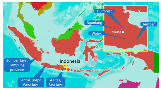 | Way Besai, Sumber Jaya, West Lampung, (2005–2006) | 5°01′29.9″–5°02′34.2″ S, 104°25′46.5″–104°26′51.4″ E | 700–1700 | 2500–2614 | Inceptisol and Andisols | Coffea, Gliricidia, Persea, Durio, Artocarpus, Aleurites |