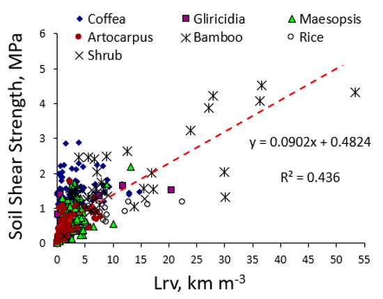 - The shear strength of a volume of soil increases proportionally to the number and strength of individual roots,