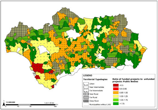 Ratio between the number of funded/unfunded projects initiated by Public Bodies according to territorial typology. Source: Junta de Andalucía. Consejería de Agricultura, Pesca y Desarrollo Rural. The authors.