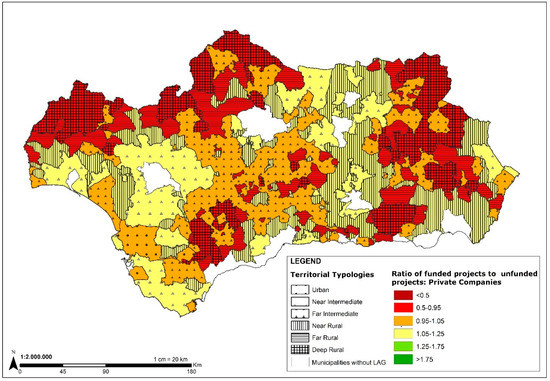 Ratio between the number of funded/unfunded projects initiated by private companies according to territorial typology. Source: Junta de Andalucía. Consejería de Agricultura, Pesca y Desarrollo Rural. The authors.