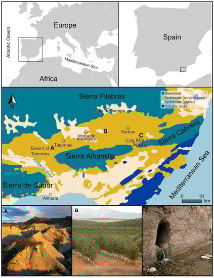 Location map of the Tabernas-Sorbas depression. (A) Typical landscape of the Desert of Tabernas. (B) Irrigated olive groves and (C) galleries made for the collection of water from the aquifer in Los Molinos spring. ((A) picture source: J. Martínez-Valderrama; (B,C) pictures source: Club Almeriense de Montañismo).