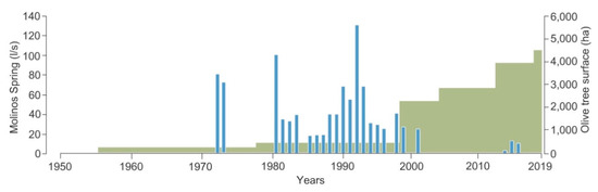 Temporal evolution of the olive grove surface under irrigation (green surface) (obtained from SIOSE database and photo-interpretation with aerial images from Google Earth) and the water flow of the Los Molinos spring (blue columns) ([35,47], Calaforra, J.M., pers. comm., 15 Dic 2019).