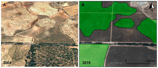 The environmental impact of intensive irrigation olive production is beyond overexploitation of aquifers. Olive orchards are included in the Spanish Plan to Combat Desertification within the desertification landscape “Woody crops affected by soil erosion” [59,60]. The main reason for this inclusion is the common agricultural practice aimed at removing any vegetation cover that exists between tree lines, since it is considered to compete for water and to decrease the yield of the olive grove. Thus, despite the protection offered by the treetops against the direct impact of raindrops, the soil is practically bare, being very vulnerable to runoff, which results in very high erosion rates [61,62]. Moreover, in this geomorphologically sensitive landscape, agricultural clearing and land levelling have triggered erosion and soil loss [23]. The changes that the territory has undergone between 2004 and 2019 to facilitate the mechanization of the monoculture has meant the clearing of small reliefs in order to achieve a flat surface, eliminating any trace of natural vegetation (Figure 4). Given the torrential nature of rainfall in the study area, typical of other dryland regions where 90% of annual precipitation can fall in <1% of the time [63], and its sensitive lithological context [64], such drastic land use change increases the risk of erosion dramatically. The consequences on the biodiversity of the area are not negligible either. The disappearance of the Aguas river also poses a serious threat to the associated wetland and its rich biodiversity (site of community importance ES6110002 Karst en yesos de Sorbas, [65]). However, far from the problem being reversed, the latest satellite images clearly show that the irrigated olive grove continues to expand and new plots await cultivation (Figure S5).