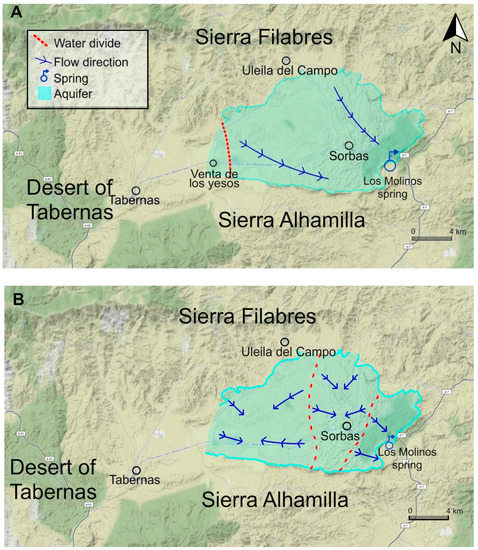 Unsustainable use of water resources is also reflected in qualitative terms. Under natural conditions, the groundwater would move from northwest to southwest in the spring’s recharge basin that extends from Venta de los Yeso and Uleila del Campo to the gypsum escarpment where the Los Molinos spring is located (Figure 5A). With the intense exploitation of water in the aquifer, extraction cones are created towards the exploitation boreholes modifying the piezometric level and the flow to the Los Molinos spring [33]. As a result, water stops flowing towards the spring (Figure 5B).