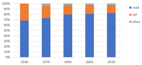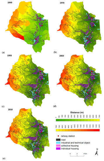 By evaluating the accessibility of the railroad stations, we exposed the formerly pivotal role of railroad transportation in localizing individual housing and large industrial premises into the city and town centers; this scenario characterizes the years 1949 and (partially) 1970. The median availability of the railroad stations for collective housing increased significantly in 1970, with the growth completed in 1993 and remaining stable since then. The median availability of the railroad stations to the industrial and technical buildings rose markedly between 1949 and 1970; since the latter year, however, the newly built enterprises were harder to access from the railroad stations. In the more recent decades, the expanding motorization process, which formed and gained momentum in the 1960s, allowed residential, industrial, and utility grounds to spread farther from the train stations, as was also necessary due to the more densely built-up central sectors of the settlements.