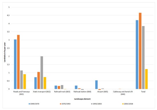 One of the partial processes forming industrialization and technologization is the landtake by transport infrastructure. This process represents the change of a landscape element into one from the category of transport-related objects and areas (from 661 to 666) between two mapping years, with the deduction of the original transportation areas that changed into other landscape elements. The derived indicator—the intensity of landtake by transport infrastructure—is defined as the ratio of landtake by transport infrastructure and the number of years in the respective period, so the unevenly long periods between the individual mapping years will be transformed into comparable numbers. Partial processes, such as the landtake by roads and freeways (change to landscape element code 661), can be also identified if necessary.