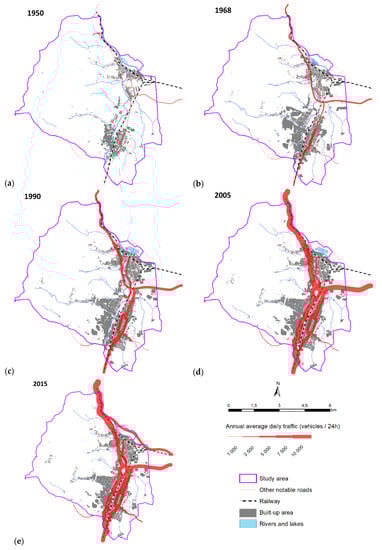 The sources that yielded the details on land use and landscape transformation further allowed us to outline the main transport networks. It was true, especially for the old topographic maps, since the aerial images cannot show the exact categorization of the identified elements to expressways, highways, or first-, second-, and, third-class roads, where first-class roads are intended mainly for long-distance and international transport, second-class road’s major use is for traffic between regions, and third-class roads are used to interconnect municipalities or to connect them to other roads. The basic transport network infrastructure was then completed with the road traffic intensity data collected from the nationwide road traffic census held in the Slovak Republic—formerly a part of Czechoslovakia—from 1949 to 1950, every five years after 1980. The census covered all expressways, highways, first- and second-class roads, and selected portions of third-class roads. Currently, following the census of 2015, a novel methodology has been applied [