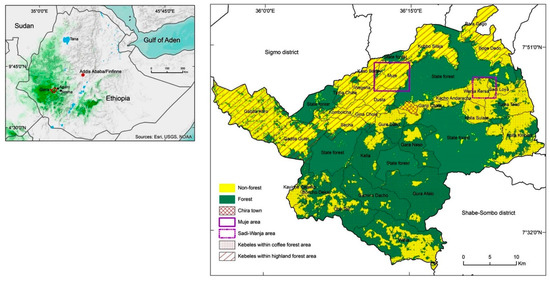 Causes of deforestation in Ethiopia include conversion to agriculture [22,23,24,25,26], and use of forests as source of wood for timber, charcoal production, firewood, and construction [27,28]. These causes are shaped by underlying drivers, including national policies, institutional instability, agricultural stagnation, poverty, and demographic pressure [22,24,25,26,29]. Southwest Ethiopia, which is the focus of this study, shelters most of Ethiopia’s remaining forests that have important social-ecological significances [30,31]. The forest in the southwest offers amiable conditions for coffee (Coffea arabica) production and the “forest coffee ecosystem” mostly in the south and southwest [32] contribute about 45% of the total coffee produced in the country [33]. Coffee is Ethiopia’s main source of foreign currency earning [34], and the need for shade trees for coffee production has had a conserving effect that has reduced the rate of deforestation over the past four decades within coffee-growing altitudes, c. 1300–2000 m [35]. In contrast to this conserving effect, a number of studies have shown that state policies (e.g., resettlement programs), demographic pressure, demand for timber and wood products, and conversion of forest to agricultural land have reduced forest cover in the region (e.g., [23,36,37,38,39]). However, what remains to be studied in more detail is how farmers’ practices (e.g., coffee production) have interacted with state policies (e.g., logging quotas in the 1980s and early 1990s). This would lead to a better understanding of how such interactions have shaped forest cover change, both through mechanisms of deforestation and processes that favor forest maintenance.