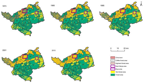 In this study, we took the case of Gera district within southwest Ethiopia to investigate the spatial relations of ecological and social processes. More specifically, we wanted to see how state policies, migration dynamics, topography (slope and elevation), and the ecological and socio-economic values of ‘forest coffee’ have shaped forest cover changes over time and across space. We investigated (i) the mechanisms of deforestation and conservation at smaller scales, and (ii) how they add up to patterns at larger scales (sub-district) and links across landscapes. To do this, we combined an analysis of remote sensing data with data from participatory field mapping, interviews, focus group discussions, and population censuses. We quantified forest and non-forest area changes based on a classification of 30 kebeles (kebele is the lowest administrative unit in Ethiopia) of Gera district into a coffee forest area, hereafter coffee areas (n = 17), and highland forest area, i.e., the zone above coffee-growing altitudes, hereafter highland areas (n = 13) and state forest sites (n = 6). In a second step, we matched this pattern with the social-ecological drivers, e.g., agriculture and coffee production, slope, population density, and polices, that we could identify.