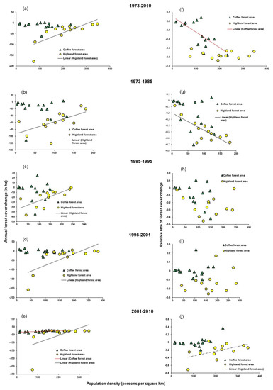 Correlation between forest cover changes (area and relative) and population density in kebeles in coffee and highland forest areas of Gera. Chira town is not included in the graph and statistical test for which the p-values are reported. The linear trend lines are included where the p-values for Spearman’s rank correlation tests are <0.05 (solid) and 0.067 (dotted). The y-values are forest cover changes (area, a–e; relative, f–j) during 1973–2010, 1973–1985, 1985–1995, 1995–2001, and 2001–2010, while the x-values are population densities in 2010 (a,e,f,j), 1985 (b,g), 1995 (c,h), and 2001 (d,i) for the kebeles in coffee and highland forest areas.