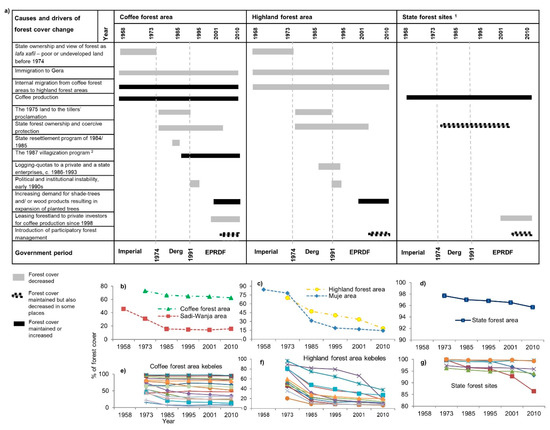 Summary of causes and drivers of forest cover change and percentages of forest cover in coffee and highland forest areas and state forest sites of Gera, 1958–2010 (a). Imperial refers to the pre-1974 feudal monarchy; Derg was the socialist military government; and EPRDF stands for Ethiopian People’s Revolutionary Democratic Front, a party that took government power since 1991. The y-values (b–g) are percentages of forest cover in 1958, 1973, 1985, 1995, 2001, and 2010. Blank spaces in (a) indicate that the driver is not relevant or that data is lacking for that specific land area. 1 Some of the state forest sites include forest and semi-managed forest coffee. 2 In the villagization program, the Derg government forced farmers in and around forests to move to a newly established village far from forest edges. This move led to forest recovery in limited parts of a small number of coffee area kebeles, e.g., Wanja Kersa, since the fields were left uncultivated. Afterwards, the recovered forest was maintained.
