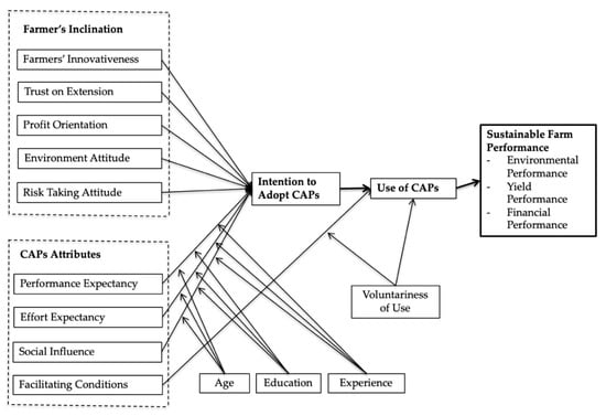 This study addresses three research questions: (1) how does the intention to adopt CAPs develop among the rice farmers? (2) what are the factors that promote the actual uptake of CAPs? Furthermore, (3) to what extent does the use of CAPs affect sustainable farm performance? We find no study that utilises the personal capacities and perception of CAPs characteristics among farmers enabling the CAPs adoption. There is a lack of studies on the intention to adopt and use CAPs using the theory of planned behaviour (TPB) and the technology adoption model (TAM).