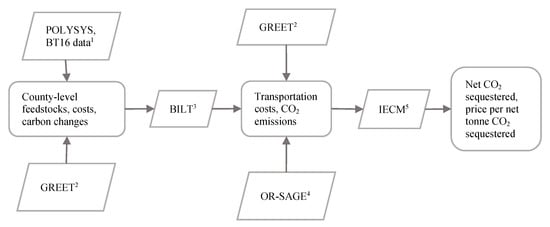 Generalized workflow diagram to quantify potential net tonnes of CO2 sequestered, and $ per net tonne CO2 sequestered with bioenergy with carbon capture and storage (BECCS). Key data inputs and model descriptions include: (1) feedstock outputs from the US Department of Energy (USDOE) (2016) [], (2) CO2 emissions outputs from Greenhouse gases, Regulated Emissions, and Energy use in Transportation (GREET®) model outputs from USDOE (2017) [], (3) transportation costs and associated CO2 emissions from the Biofuel Infrastructure, Logistics and Transportation Model (BILT), (4) biorefinery siting locations with the Oak Ridge Siting Analysis for power Generation Expansion (OR-SAGE), and (5) costs of electricity and CO2 net sequestration from the Integrated Environmental Control Model (IECM).