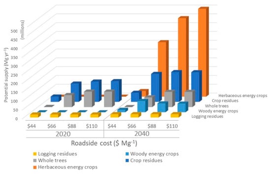 Biomass feedstocks in this analysis include some that are abundantly available in the near term, and others that could be available in the future given adequate market demand. Near-term feedstocks in this analysis include corn stover, cereal straws, logging residues, and small-diameter whole trees; long-term feedstocks additionally include biomass energy crops, e.g., switchgrass, miscanthus, poplars, and willow. Data for these feedstocks were sourced from the online supplemental data from USDOE [] available at https://bioenergykdf.net/bt16-2-download-tool/county. County-level feedstock data were used from the base case for agricultural residues and energy crops, and from the medium housing, low energy demand scenarios for logging residues and small-diameter whole trees. Supplies included feedstocks at roadside prices (i.e., prices after harvest but before delivery) ranging from $33 to $110 per dry tonne ($30 to $100 per dry ton) in $10 increments. To allow flexibility for subsequent logistics modeling to account for tradeoffs between distance and farmgate price, marginal supplies at $10 increments were calculated. For rare instances of negative marginal supplies, attributable to land competition between energy crops as prices increase, marginal supplies were assumed to be zero. National supplies used in this analysis by feedstock category at select prices are shown in Figure 2 and shown disaggregated into the twenty-three biomass types in Tables S2 and S3 in the Supplementary Materials. Total supplies up to $110 per tonne for the near term (2020) and long term (2040) are 302 and 823, respectively. The spatial distribution of potential biomass resource types in the US is expected to be affected by climate change, but potential biomass production in total in the US is not expected to change significantly []. Assumptions of CO2 emissions from feedstock production and harvest that are used in this analysis are shown in Supplementary Materials Table S1.