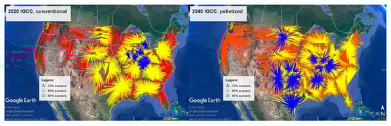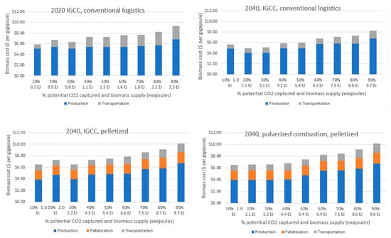 Given (1) potential county-level biomass feedstock quantities and prices, and (2) potential BECCS locations, feedstock allocation from counties to power plants was determined. This was needed to quantify delivered feedstock costs and CO2 emissions associated with handling and logistics. This was simulated using the Biofuel Infrastructure, Logistics, and Transportation (BILT) model. BILT is an optimization model that minimizes operational cost across potential facility locations, transportation routes, and logistical options []. An advantage of BILT is that it is multi-modal, solving across stages of the supply chain, including raw feedstock, preprocessed feedstock, and a final product (e.g., biofuel). This analysis used BILT to allocate biomass feedstocks to potential biorefinery locations, assign logistics and transportation costs, and report transportation quantities and distances as an input to quantify CO2 emissions. Assumed costs and assumed CO2 emissions from biomass production, harvesting, transportation, and preprocessing are shown in Supplementary Materials Table S1. BILT was executed for the scenarios shown Table 2 at varying rates of CO2 capture, i.e., BILT was first run targeting the least-cost capture of 10% of the total potential CO2 capture, then again capturing the least-cost 20% of the total potential, up to 90% at 10% increments. As shown in Table 2, two biomass logistics scenarios were included. The conventional biomass logistics system assumes biomass is trucked from fieldside to power plants, as bales and chips for herbaceous and woody feedstocks, respectively. The pelletized biomass logistics system assumes that biomass is first trucked to processing depots as for the conventional system, and subsequently pelletized and trucked as pellets from the depots to power plants. Resulting biomass feedstock quantities and weighted-average costs modeled in the four scenarios and nine CO2 capture levels are shown in Figure 5. An example of allocation of county-level feedstocks to potential locations at 10%, 50%, and 90% CO2 capture under the 2040 IGCC, pelletized biomass, pulverized combustion scenario is illustrated in Figure 6. Notably, key areas emerge in the Midwest, Texas, and Plains States, where potential biomass resources are accessible to sequestration basins.