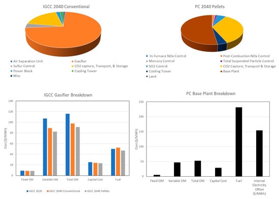 Example breakdowns from the 50% CO2 capture scenario of the average levelized cost of electricity (LCOE) across cost components of the IGCC and pulverized combustion plants are shown in the top pie graphs. Cost components of the IGCC gasifier and pulverized combustion base plant are shown in the corresponding bar graphs.