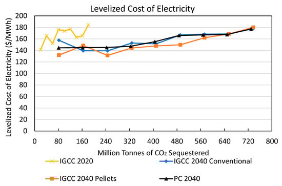Powerplant location, powerplant sizing, feedstock flow rates, and feedstock price outputs from BILT were used as inputs to simulate powerplant performance in the Integrated Environmental Control Model (IECM, []). The IECM was used to predict operation and maintenance (O&M) costs, capital costs, and revenues required to break even. Average efficiency, capital cost, fixed and variable operation and maintenance cost, and capacity factor for the pulverized combustion and IGCC scenarios assessed are shown in Table 4, Table 5, Table 6 and Table 7, and an example of cost components under the 50% CO2 capture scenario is shown in Figure 7. Power consumed by capture technologies leads to lower net power produced and lost revenue. The IECM algorithm charges each technology for the internal use of electricity and treats the charge as a credit for the base plant. When comparing individual components of the plant, these utility charges are taken into consideration. For total plant costs, the internal electricity offset balances out and has no net effect on the plant O&M costs []. Assumed discount rate and plant economic lifetime for all scenarios are 7% and 30 years, respectively. Modeling assumptions of the IECM are described in Supplementary Materials Section 5: Power generation assumptions. The levelized cost of electricity (LCOE) and CO2 emissions for the coal, natural gas combined cycle (NGCC), and BECCS plants are shown in Supplementary Materials Tables S16 and S17
