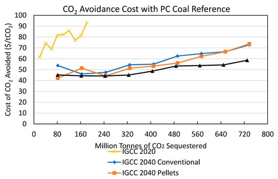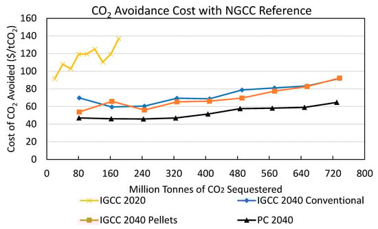 BECCS scenario-average CO2 avoidance costs (CAC) ($ per tonne CO2) by CO2 sequestered (million tonnes per year) under the pulverized coal reference scenario, net after supply chain emissions for the four BECCS scenarios: 2020 IGCC conventional, 2040 IGCC conventional, 2040 PC pellets, and 2040 IGCC pellets. “Conventional” refers to biomass handled as chips or bales; “pellets” refers to biomass converted to pellets in process depots.
