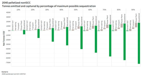As discussed in the Introduction and Methods, it has been argued that some bioenergy systems in the absence of CCS may cause carbon emissions because of changes in the amount of biomass on the landscape [,], which may require some carbon-debt repayment period [] before bioenergy can be considered carbon neutral as compared to a business-as-usual scenario. However, in the case of BECCS, 90% of the CO2 produced from power generation is not emitted, but rather is sequestered below ground. This is unlike the case of bioenergy without CCS, in which case CO2 produced from biomass is re-emitted to the atmosphere. Thus, with BECCs, because most of the carbon in harvested biomass is not emitted to the atmosphere, the carbon payback time (i.e., the time until plant growth and avoided fossil fuel emissions balance the CO2 emitted, including supply chain emissions) will be much reduced compared with bioenergy without CCS. All woody resources used in this analysis have short payback periods, i.e., 4 years for willow, 8 years for poplars, and approximately 10–14 years for whole trees (<28 cm diameter at breast height). Of these, only the whole trees from forestlands, comprising 2–39% and 0–9% in the 2020 and 2040 scenarios, respectively, could have some carbon payback period depending on site-specific conditions. Site-specific carbon accounting would depend on previous land use, the expected business-as-usual scenario, and stand-specific silvicultural conditions, and is out of the scope of this analysis. In all scenarios, more than 80% of CO2 from biomass used for BECCS is sequestered net of emissions from power generation, CCS, transportation, harvest, and production (Figure 13). Thus, in instances of whole trees from forestlands where a carbon debt repayment period may be applicable, any carbon debt repayment period would be reduced by more than 80%. Resources that incur a carbon payback period could be avoided, and feedstocks that provide carbon sequestration and other environmental services on the landscape could be incentivized.