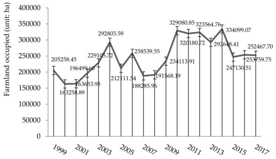 In recent decades, China has witnessed dramatic changes of land use/cover driven by rapid urbanization [,]. Nevertheless, urban development is dominated by urban sprawl and urban land use is inefficient. According to the findings in Jiao [], most of the cities in China expanded rapidly and became less compact and more dispersed in recent years. Additionally, the rates at which the land use efficiency increased among cities were significantly low, with an average rate of 0.17% during 2007–2015 []. Under these circumstances, cities expand space mainly by occupying farmland, rather than by increasing the efficiency of land within the city. According to the latest China Land and Resources Statistical Yearbook, around 4.69 million ha of farmland has been occupied during 1999–2017 due to the significant demand of urban land for economic growth in China (Figure 1) []. There is clearly an urgent need to improve the urban land efficiency and to slow down the farmland loss in China.