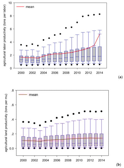 Agricultural labor productivity (a) and farmland productivity (b) in rural China (2000–2014).