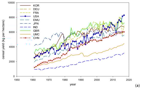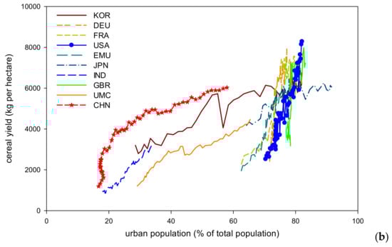 International comparison of cereal yield (a) and the relationship between cereal yield and urbanization rate (b) (1961–2017). Notes: KOR: Korea, Rep.; DEU: Germany; FRA: France; USA: United States; EMU: Euro area; JPN: Japan; IND: India; GBR: United Kingdom; UMC: Upper middle income; CHN: China. Data are collected from the World Bank database.