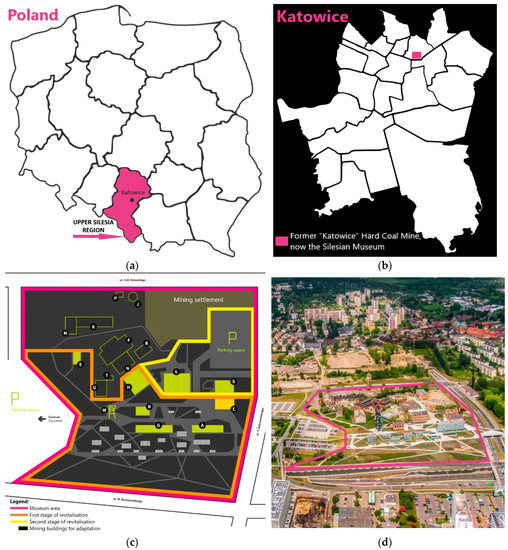 Research area location: (a) Location of Upper Silesia region and the city of Katowice in Poland; (b) Location of “Katowice” Hard Coal Mine, currently the Silesian Museum in Katowice; (c) Plan of the Silesian Museum with revitalisation (development) zones. Historical mining buildings: R—“Warszawa” shaft lift engine house (now a restaurant), W—“Warszawa” shaft lift tower (now an observation tower), C—Clothing warehouse (now the Centre of Polish Scenography), M—Mechanical workshop, K—Smithy (M and K now an Exhibition—the history of local industry in Upper Silesia), S—Carpentry (now a Carpentry Gallery and Stage), Ł—Bath (now a Bath Gallery), E—Electricians’ workshop, B—Bartosz shaft engine room, N—Bartosz shaft building, B—Bartosz shaft engine room, F—Bartosz electric power station, T—Drillers’ workshop, U—“Gwarek” baths, J—Water tower, P—Saddler’s workshop. New buildings: A—Administration, café, library, auditorium, G—Main entrance, ticket windows, exhibitions, museum shop, H—Central hall, ticket window, information desk; (d) Aerial view of the Silesian Museum (as of 2016). Own source based on: (c) https://muzeumslaskie.pl/pl/architektura-i-przestrzen/ (access: 28 August 2020) (d) photo: K. Krzemiński.