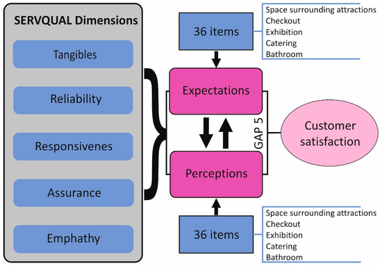 The respondents make assessments twice—before and after visiting the museum. This made it possible to familiarise oneself with the expectations and juxtapose them with the delivered service. A difference in their evaluations serves as a basis for demonstrating gaps in the offering. It is proposed that substantial differences in the assessments prove the presence of deficiencies in the service. The method is often expressed using the following formula [45]: