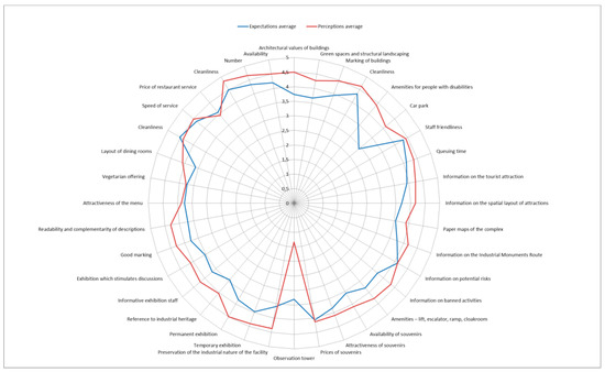 Arithmetic average for the individual questions were calculated. The analysis suggests that the visitors’ expectations were the greatest as regards the “cleanliness of restaurant space” ( = 4.53). The visitors had only slightly lower expectations concerning the “cleanliness of bathrooms” ( = 4.50). Other significant elements were the “speed of service in the restaurant space” ( = 4.37), “cleanliness of space surrounding attractions” ( = 4.33), “checkout staff friendliness” ( = 4.33), “number of bathrooms” ( = 4.33) and their “availability” ( = 4.20). Also important were “queuing time” ( = 4.10) and “information on potential risks” ( = 4.10). Furthermore, the “price of restaurant service” ( = 4.07) and “prices of souvenirs” ( = 4.07) also constituted significant factors. The exhibition and their constituents were ranked as less important—“temporary exhibition“— interesting composition, presenting the problem as a logical whole” ( = 3.97), “permanent exhibition—interesting composition, presenting the problem as a logical whole” ( = 3.83). The visitors’ expectations as regards the exhibition “related to industrial heritage” were surprisingly low (x = 3.43). The visitors had the lowest expectations in respect of the “observation tower” ( = 3.30). The arithmetic average for all the items in the questionnaire was = 3.84, with a standard deviation of δ= 0.35. This proves that the visited attractions had to meet relatively high requirements.