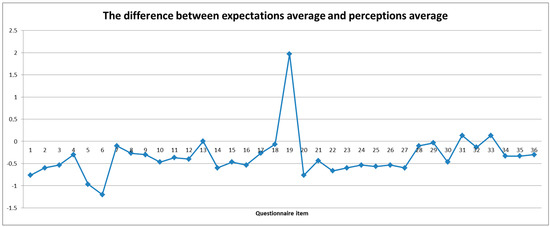 After visiting the Silesian Museum, the surveyed individuals completed a questionnaire concerning their evaluation of the delivered service. The items concerning the “cleanliness of bathrooms” ( = 4.83), “number of bathrooms” ( = 4.67) and “cleanliness of space surrounding attractions” ( = 4.63) were ranked the highest. Additionally, those related to the “architectural values of buildings” ( = 4.50), “permanent exhibition interesting composition, presenting the problem as a logical whole” ( = 4.5), “speed of service (…) ( = 4.50) and “availability of bathrooms” ( = 4.50) received high scores. In addition, the “marking of buildings” ( = 4.47) and “checkout staff friendliness” ( = 4.43) were appreciated by the visitors. The “observation tower” ( = 1.33) garnered the lowest scores. Due to the anonymity of the questionnaire, it was not possible to compare the responses between representatives of different nationalities. The mean score was high and amounted to = 4.18, with a standard deviation of δ=0.54. The results of the study are presented in Table 5. The charts of the dependence of expectations and perception of individual items in the questionnaire is included in Figure 6. Figure 7 charts of the difference between expectations average and perceptions average.