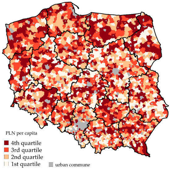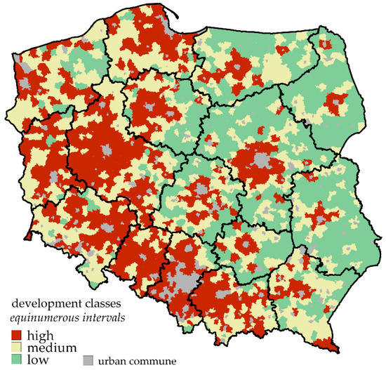 Rural communes in Poland are highly spatially diversified, which is a consequence of natural conditions as well as historical events in different regions. There are many discussions in the literature on the relationship between economic conditions and the advantages that some areas owe to their geographical location [1,2,3]. These are identified with benefits of communes’ location in relation to urban centres, and also to some extent with the diversity of the rural settlement network [4,5]. A great diversity of rural areas is not characteristic for Poland. There are also differences, for example, between northern and southern Italy [6], and between former West Germany and East Germany [7], and in almost every country between suburban and peripheral locations [5,8,9,10]. Promoting less developed areas is the primary objective of the Cohesion Policy [11]. However, levelling out differences in the development of areas (regions) is determined by the potential of limited human resources, social capital, financial capacity, or the local economies [12,13].
