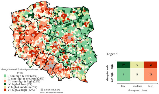Once the two hierarchical scales described above were obtained, they were collated with the help of an array ordering the communes (see key in Figure 3). Each commune was assigned to one of six types of similar units with a specified level of development (x-axis in the Figure 3 key) and allocation of Cohesion Policy funding (y-axis in the Figure 3 key). The first step in the research procedure involved using the classification of communes by development level, forming three equinumerous classes: communes with a low development level, communes with a medium development level, and communes with a high development level. Next, two of these three classes were distinguished using the “absorption level” variable: the high (comprising the fourth quartile) and the non-high level. In addition, the relationship between the development level and the absorption level was verified using Spearman’s rank correlation coefficient (Spearman’s rho) with respect to the ordering scale of the development level measure.