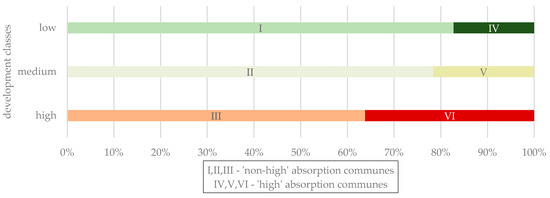 The result of the research procedure in which every commune was placed in one of the array’s six groups is presented spatially (Figure 3) and expressed as the percentage of high/non-high absorption communes in the three socio-economic development classes (Figure 4). Furthermore, in order to characterise the different groups, the statistics of selected variables are also presented (Table 2). This step provided an answer to the question of whether a high level of EU funding absorption is connected with specific local conditions of socio-economic development (such as human resources possibilities, social capital, financial capacity, or the structure of the local economy).