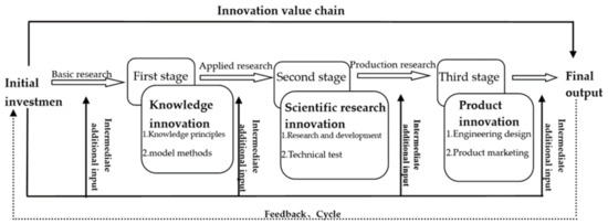 The concept of the innovation value chain was proposed by Hansen and Birkinshaw (2007), who explained that the generation, transformation and dissemination of ideas in innovation are multistage and interrelated [37]. Roperd et al. believe that it is the process of knowledge acquisition, transformation and utilization [38]. From the perspective of globalization, Kramer (2011) determined the contents of the innovation value chain from value sharing [39]. Lee, J. (2012) extended the perspective of the innovation value chain to developing countries, and further analyzed and supplemented its application value [40]. According to the relevant literature, the innovation chain is market-oriented and based on the innovation needs of enterprises, and takes innovation theory as the core element [41]. The innovation value chain is a new theoretical edge concept that combines technology innovation theory with value chain theory [42].