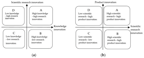 Cities in urban agglomerations show differences between the stages of efficiency of innovation and the three-phase contact operation mechanism of urban agglomeration of the innovation value chain. We constructed a two–dimensional innovation efficiency matrix of “knowledge–scientific research” innovation efficiency and “scientific research–product” innovation efficiency of the regional innovation urban agglomerations (as shown in the diagrams (a) and (b) in Figure 2) [27]. The average efficiency of cities at different stages can be divided into four efficiency combinations according to the value of the two efficiency dimensions. Different combination modes represent different efficiency states, thus providing a basic idea for the improvement of innovation efficiency in urban agglomeration. These four types of efficiency combination regions are, respectively, the combination of “one high and one low” represented by B and D, the combination of “double low” represented by C and the combination of “double high” represented by A. This division is convenient for cities in different quadrants when searching for appropriate theoretical reference paths to improve innovation efficiency according to their development conditions.