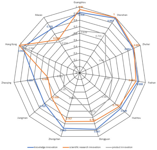 By comparing the efficiency values of the three stages in the innovation process (as shown in Figure 3), it is not difficult to find that with the progress of innovation, the innovation efficiency becomes increasingly lower in the process from knowledge innovation to scientific research innovation and finally to product innovation. The innovation efficiency decreased from 0.852 in the knowledge innovation stage to 0.788 in the scientific research innovation stage and was only 0.542 in the product innovation stage. From the composition of the main bodies of innovation activities, the main bodies of innovation in the GBA are the government, enterprises, universities, research institutes and science and technology intermediaries. Knowledge innovation mainly relies on universities. There are many universities (162 in total) in the GBA [52], so the GBA has high efficiency in the stage of knowledge innovation. Scientific research innovation mainly relies on scientific research institutes and scientific research intermediaries, and the number of patent applications is mainly taken into account when testing the results in this stage. The overall efficiency of the scientific research innovation stage was lower than that of the first stage, indicating that the innovation efficiency of the transfer from knowledge innovation to scientific research innovation in the innovation process needs to be enhanced. The relatively low efficiency in the stage of product innovation reflects that the transformation of innovative product results is not ideal. The reason may be that the technical maturity of the scientific and technological achievements of some universities is low, and they lack accurate docking with the industry and market demand [53]. At the same time, the evaluation and pricing mechanism of scientific research results is not perfect; the steps are tedious, time–consuming, and lengthy, which affects the transformation time and leads to the low efficiency of overall product innovation in the GBA. At present, there is a lack of interaction and communication among innovation players in the GBA, and the coordination ability is weak. The synergistic effect between enterprises and other innovation players such as universities and research institutes has not been played. The knowledge spillover benefit and technology diffusion effect produced by innovation activities are non-significant [54]; the synergistic value-added effect of the value chain innovation between enterprises and the system innovation effect between enterprises and the government did not lead to an effective value [55].