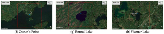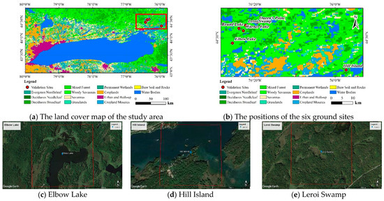 The land cover map of the study area (a) and the positions of the six ground sites (b) indicated by the red rectangles, obtained in 2017. The land cover map was obtained from MODIS land cover product MCD12Q1, in which the International Geosphere-Biosphere Program (IGBP) global vegetation classification was chosen: 1. Evergreen Needleleaf 3. Deciduous Needleleaf 4. Deciduous Broadleaf 5. Mixed Forest 8. Woody Savannas 9. Savannas 10. Grasslands 11. Permanent Wetlands 12. Croplands 13. Urban and Built-up 14. Cropland Mosaics 16. Bare Soil and Rocks 17. Water Bodies. The satellite images of the six ground sites are downloaded from Google Earth. (c–h) indicates the positions and land cover details of the six ground sites: (c) Elbow Lake, (d) Hill Island, (e) Leroi Swamp, (f) Queen’s Point, (g) Round Lake, (h) Warner Lake.