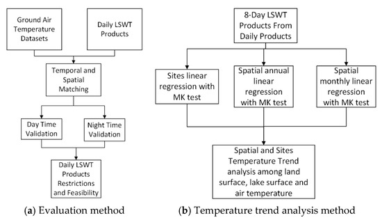Figure 2 shows the scheme used in this paper. The evaluation part is important in remote sensing data applications, especially in climate analysis. Therefore, the daily LSWT products were first compared with ground air temperature measurements (Figure 2a). The daily LSWT products’ restrictions and feasibility could be obtained in this process. Based on the LSWT products’ performance analysis, the LSWT datasets were then used in the temperature trend analysis (Figure 2b). After that the site’s linear regression with an MK test was conducted and the results were analyzed.