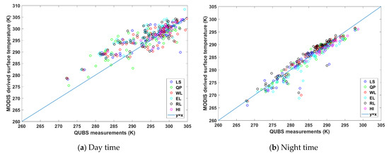 Scatter plots for temperature between MYD11A2 products and QUBS datasets for flooding seasons (March to September) of 2015–2017: (a) daytime; (b) nighttime.