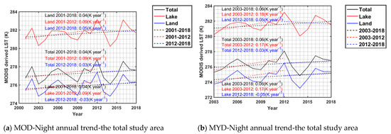 Further analysis was performed on the trend of total average temperature, with the data passing the 95% confidence threshold over the whole study region from MOD11A2 and MYD11A2 during 2001–2018 (Figure 4). The lake and land were differentiated using the HydroLAKES database (http://wp.geog.mcgill.ca/hydrolab/, accessed on 1 May 2021). MOD and MYD datasets showed similar trends for the total, lake and land regions. Generally, we found warming of 0.17 K year−1 for MYD total during 2003–2012, and there was slight warming of 0.06 K year−1 for the same datasets during 2003–2018. The MYD datasets show much clearer warming trends than the MOD datasets for both total and land regions. The MYD datasets for the lake region showed a warming trend both during 2003–2018 and during 2003–2012, and a slight cooling trend during 2012–2018.