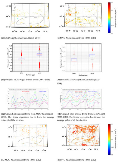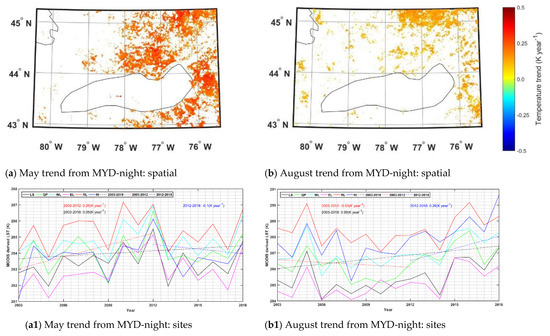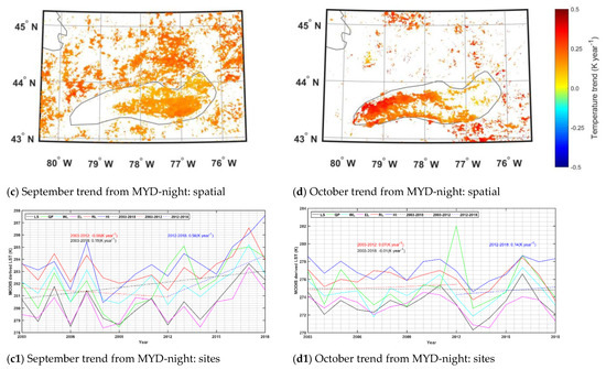 The spatial annual trend also showed a slight warming trend from 2003–2012 for MYD11A1 night datasets. Compared with other months the monthly temperatures of September and October over the study area show slight warming trends from 2003 to 2018. However, Lake Ontario showed less warming than its surroundings. Overall, the warming trend is much clearer during 2003–2012 than during 2003–2018.