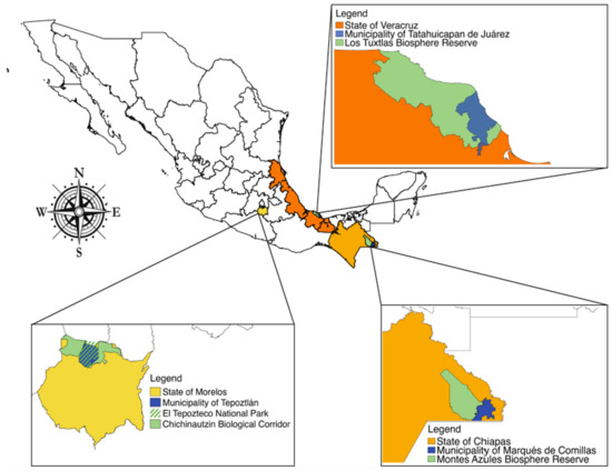 Due to the coastal location of the Sierra of Santa Marta; its altitudinal range from sea level to 1700 masl (including the volcanoes of Santa Marta, San Martín Pajapan, and San Martín Tuxtla); and its humid tropical climate (annual average precipitation > 4000 mm), many vegetation types are found, with a predominance of rainforest, cloud forest, and pine-oak forest in various stages of succession. The convergence of two biogeographical regions (Neartic and Neotropical) explains its great biological richness and high plant endemism [50,51]3. For this reason, in 1980, it was declared a Forestry Protection and Wild Fauna Refuge Zone, and in 1998, the Los Tuxtlas Biosphere Reserve.