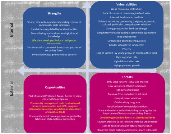 Some internal strengths of the communities could be developed to foster natural regeneration. If communal decision making bodies could be strengthened, they could better control their territories and regulate the land market, for example, prohibiting land sale to non-community residents, as some communities have done, and excluding outsiders from community assembly decisions. Developing “life plans” regarding the community’s environmental and economic future or “territorial management codes”—community maps including conservation, communal use, and agricultural areas as a result of agreements among community members, which have been applied in other communities of Mexico [110], could strengthen community regulations and facilitate conservation of primary and secondary forests (Figure 2).
