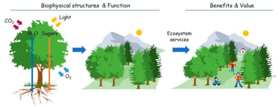 Schematic illustration of the concept of ecosystem services (inspired by de Groot et al. [46,47]), representing benefits and values for human well-being, deriving from plants and/or biophysical structures and functions implemented in green spaces.