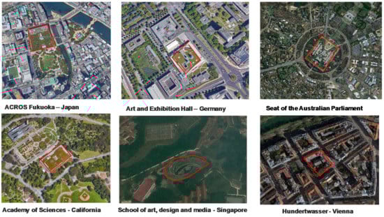 Images showing the situation of some famous green roof (base maps from Google Maps).