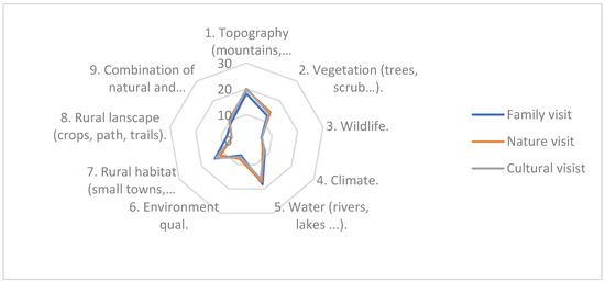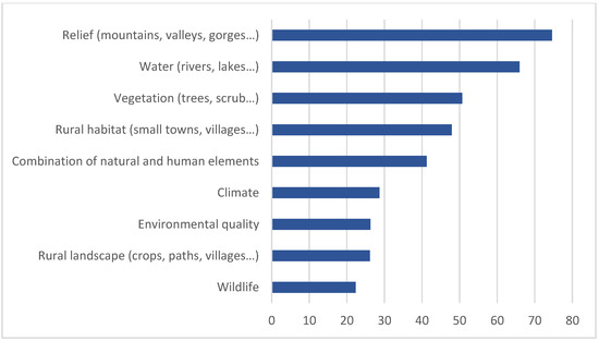 The three types of trip (for family reasons, to enjoy nature or cultural heritage) generated very few differences in the elements that shape the personality of the landscape. Broadly speaking, the predominance of the natural components is clear. First is the relief (mountains, valleys, gorges, etc.), accounting for more than 19% of answers, and the water landscapes (17%). At the second level, we find the vegetation cover (13%), the rural habitat (12%) and the integration of the environment and human activity (11%). The other elements scored considerably lower: climatic characteristics and heritage generated by agricultural activities (paths, plots of land, crop fields) (less than 7%), and wildlife, which is not considered a significant element (Figure 2).